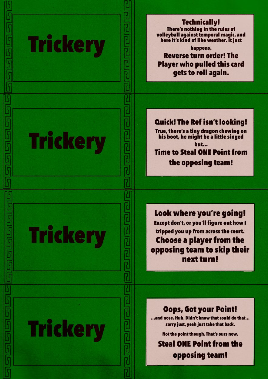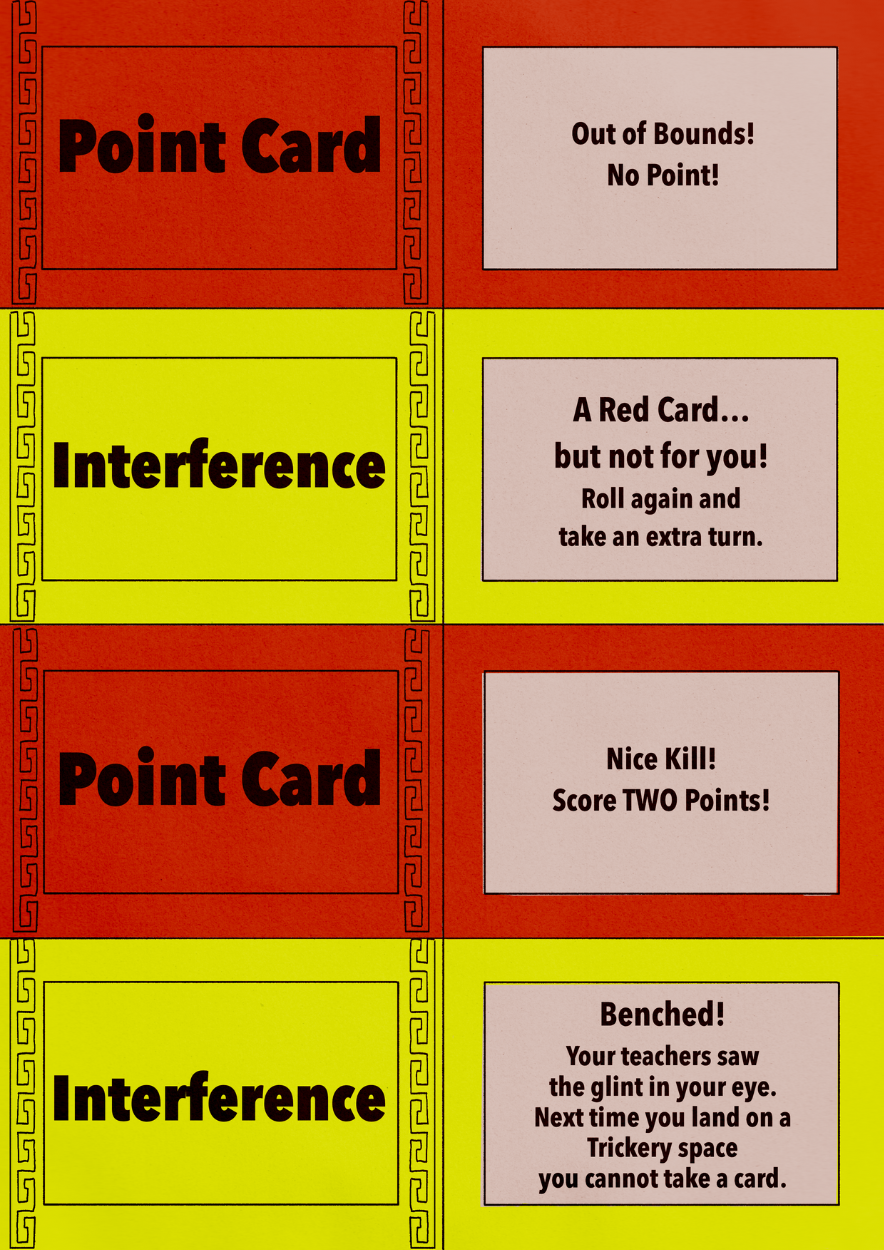 Comes with 12 unique Trickery Cards, 6 Point Cards and 6 Interference cards (the 6 card decks are meant to be printed twice so each deck is 12 cards each)